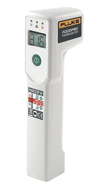 Fluke FoodPro non-contact thermometer is the first line of defense against improper receiving, storage and holding temperatures. Using an infrared measurement technique, the highly accurate FoodPro quickly reads surface temperatures, allowing workers to make rapid and frequent temperature measurements – faster than contact units and without fear of cross contamination. The easy-to-see illumination light shows you the measurement area.